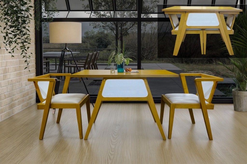 Mesa em eucalipto, tampo laminado em Tauari, lateral detalhes em tela sintética - Cadeira encosto tela sintética, assento fixo.